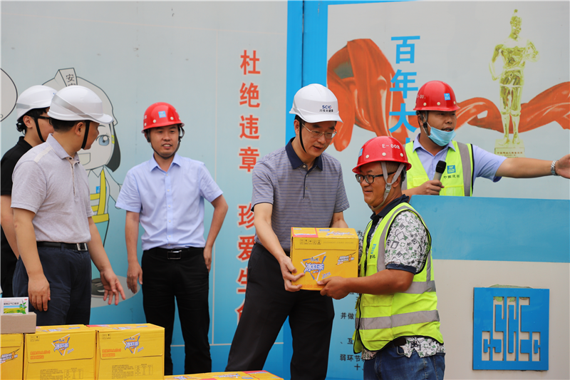 在檢查過程中,田傳平總助還代表集團公司,向一線管理人員、監(jiān)理人員、施工人員代表表示慰問,并發(fā)放防暑降溫慰問物品。