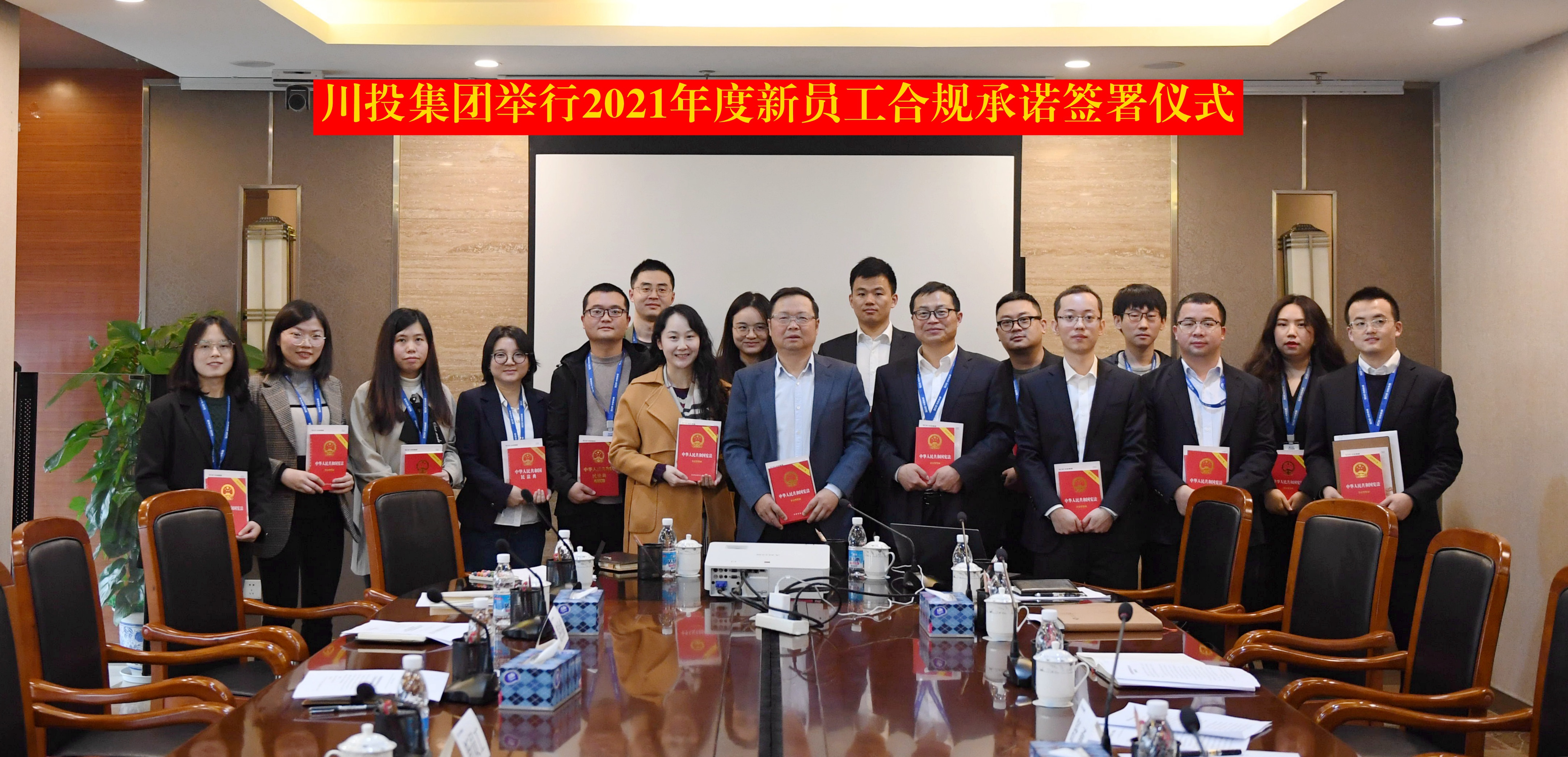 會議現(xiàn)場舒勇向新員工發(fā)放了《憲法》《民法典》《川投集團法律風險防范案例選編 》等法治書籍,集團公司總法律顧問、法律事務部部長楊帆領學了《川投集團誠信合規(guī)手冊》,新員工現(xiàn)場簽署了合規(guī)承諾書。