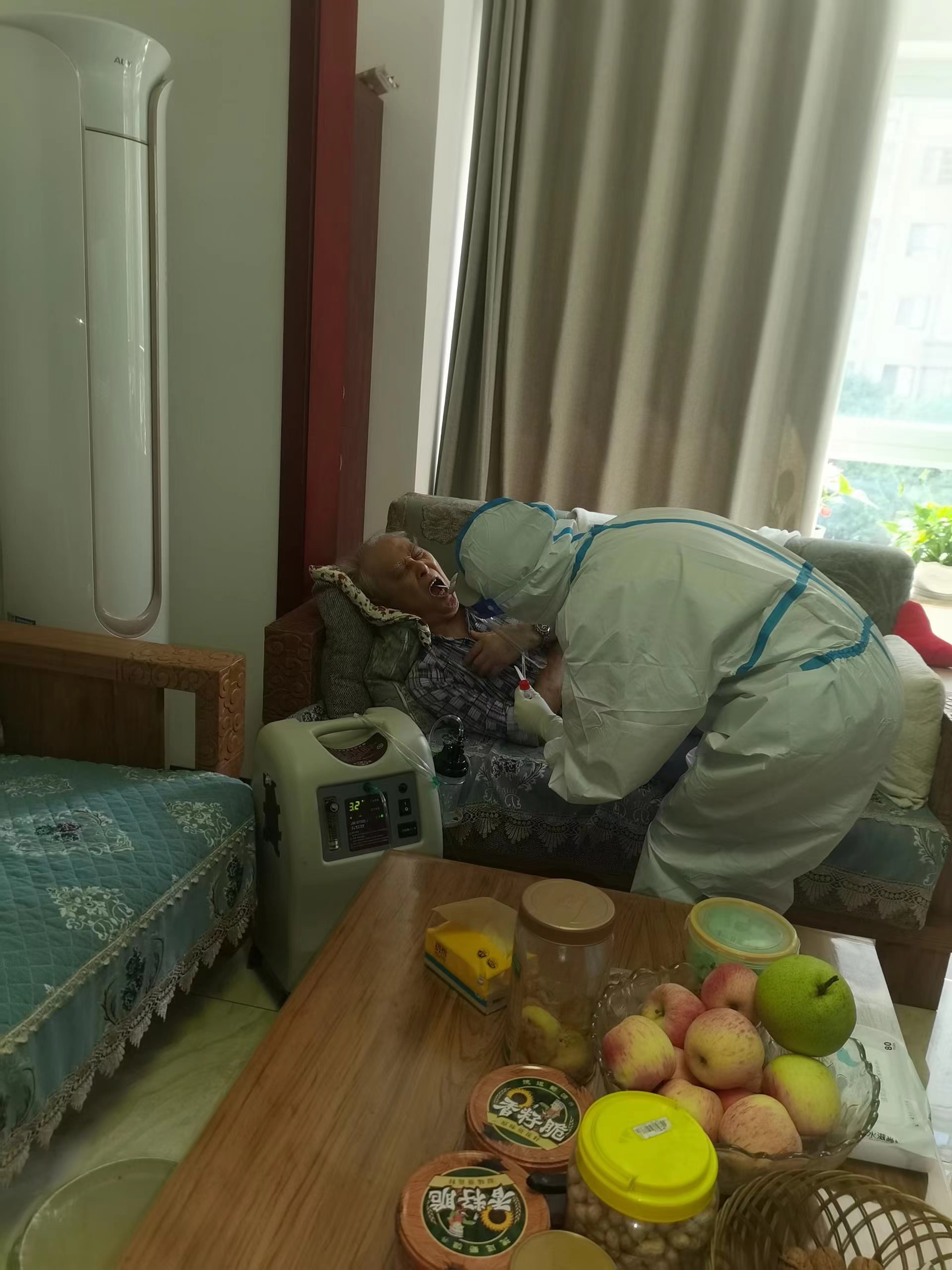 因年齡較大且患有心臟疾病,行動(dòng)不便的王爺爺沒能到社區(qū)規(guī)定的核酸采樣點(diǎn)采集核酸。了解到這一情況后,正在該社區(qū)執(zhí)行采樣任務(wù)的袁成程利用空余時(shí)間,在社區(qū)志愿者的引導(dǎo)下,身穿防護(hù)服,敲響了王爺爺家的門,為他提供了上門采集服務(wù)。